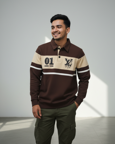 Men’s Brown Beige Rugby Sweatshirt – LV Print Long Sleeve Polo | ComfortsBD #1005-2