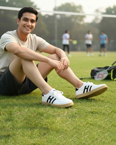 Elevate your casual footwear game with this stylish white trainer featuring an eye-catching black “H”-stripe side detail and premium gum-rubber sole — available now at ComfortsBD.